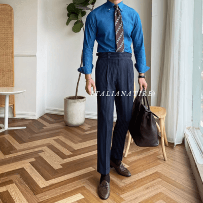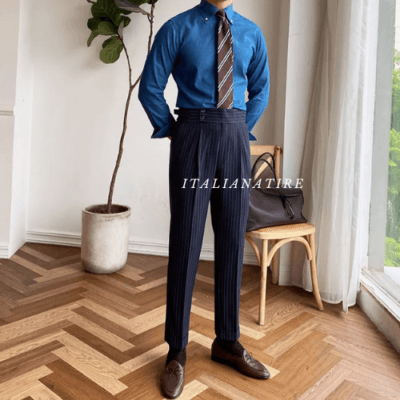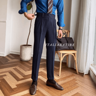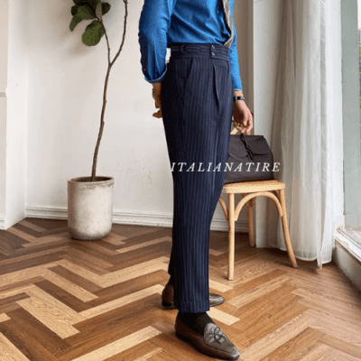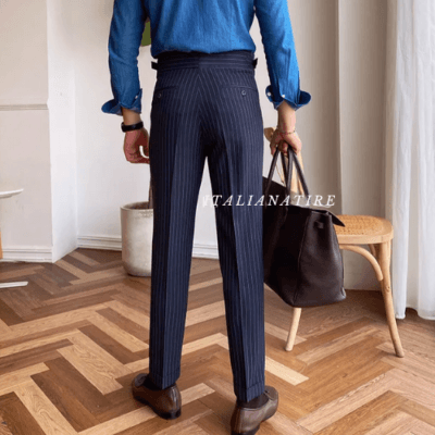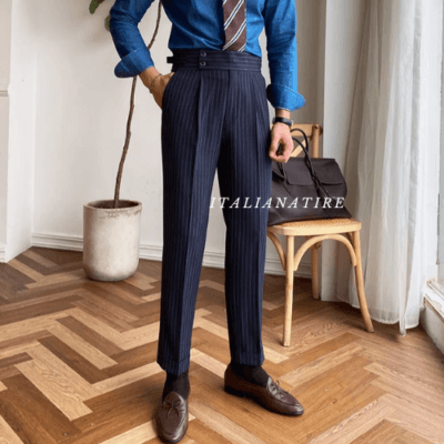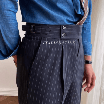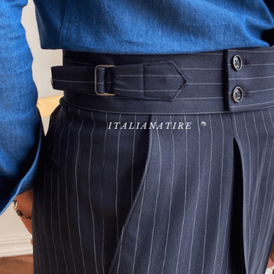 Navy Striped Buttoned Gurkha Pants -by-Italian Atire